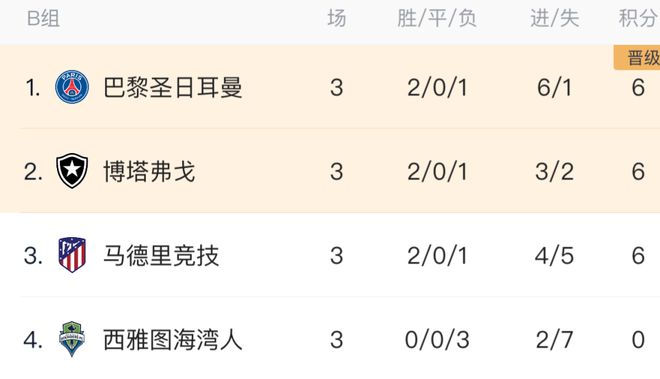 After the Group B matches, Paris Saint-Germain, Botafogo and Atlético Madrid all had two wins and one loss, accumulating 6 points each. Paris Saint-Germain and Botafogo advanced together. Atlético Madrid finished in third place in the group and was disappointed to be eliminated. Seattle Sounders suffered three consecutive losses and scored 0 points, ranking last.