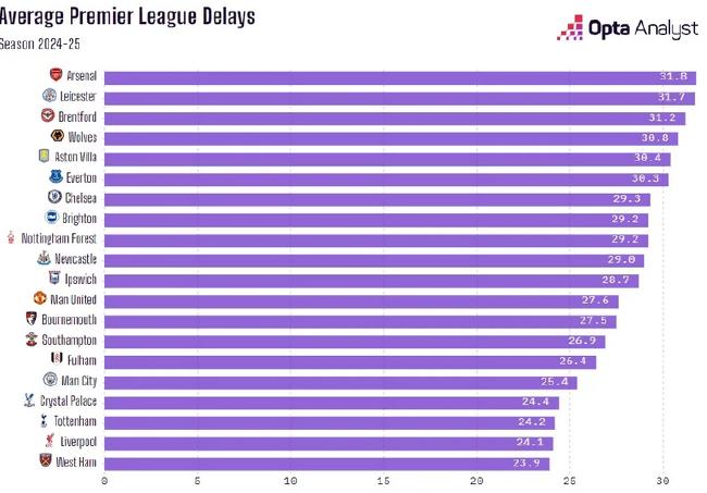 According to statistics, Arsenal's average kick-off time after a dead ball is 31.8 seconds, a statistic that makes them the slowest serving team in the Premier League. Whether it was a free-kick, goal kick, penalty kick or throw-in, Arsenal seemed to take their time. In addition, Arsenal took an average of 44.6 seconds to kick a corner, also among the slowest teams in the Premier League.