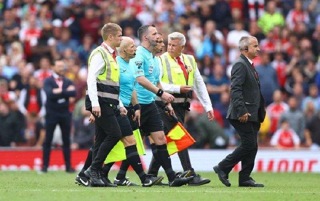 The Arsenal match referee was escorted off the pitch after upsetting fans [jiayu]